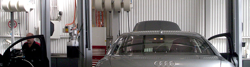 Automotive workshop fit-out with lubrication hose reels mounted in between service bays, Audi Parramatta