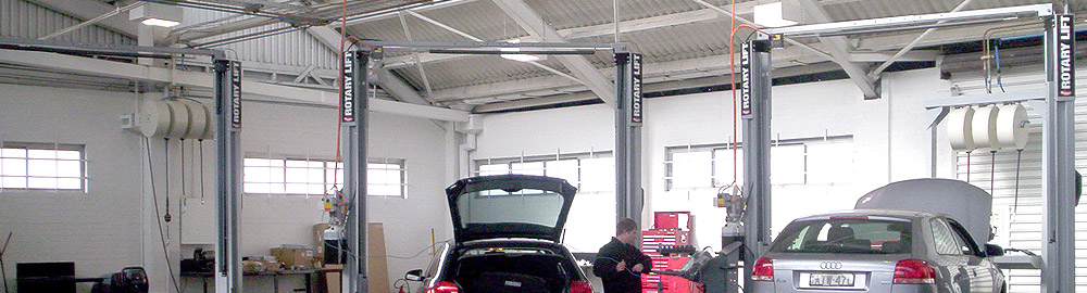 Automotive workshop fit-out with 2 post hoists and lubrication reels at end of each service bay