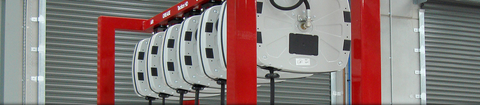 lubrication hose reels mounted on external building wall at entry to workshop facility